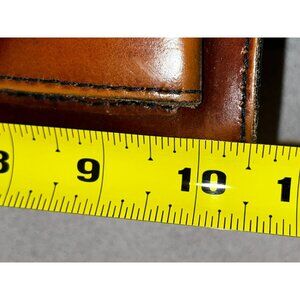 Shows well with light scratches to leather. Straps and hardware shows well. Roughly 10" square.