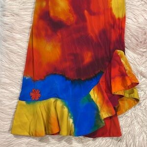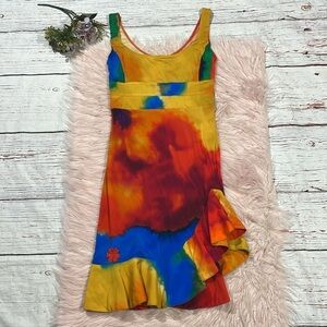 Paco Rabanne colorful tie dye ruffle hem tank mini dress with little floral detail on the hem. This dress is a size 40 which is equal to a size 8 and is in great used condition