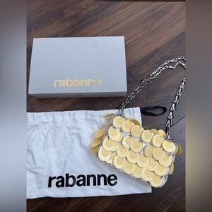 This unique Rabanne hand bag is crafted of lightweight discs.