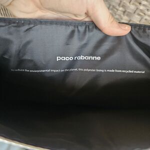 The Paco Rabanne Invictus Metallic Silver Dry Backpack Weekend Unisex Cross Body Bag is a large, stylish backpack designed for both men and women. Made of durable nylon with a solid silver exterior color and black lining, this bag features a sleek buckle closure and silver hardware accents. The bag has a width of 16 inches, a height of 18 inches, and a depth of 6 inches, making it perfect for carrying essentials on the go. The black nylon handle/strap adds a modern touch to the overall design, making it a versatile accessory for any wardrobe. Pre-owned