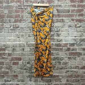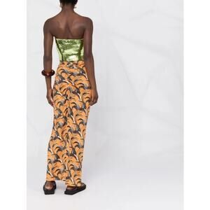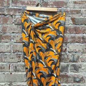 Orange printed viscose (95% Viscose, 5% Elastane). Midi skirt. Back zipper closure. Imported.