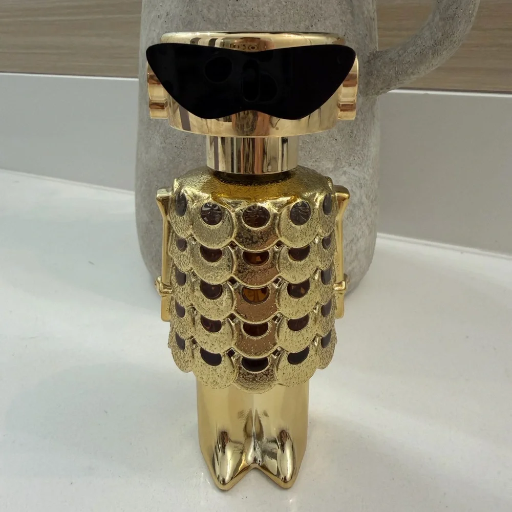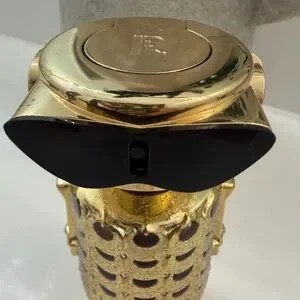 Stylish Paco Rabanne collectible bottle. Shiny gold finish with black accents. Sculptural, eye-catching design. Great for display or gifting.
