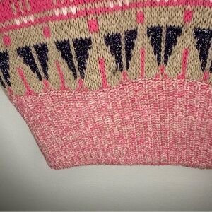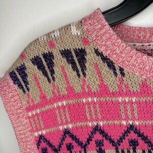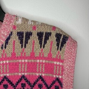 Size XL. Excellent condition, no flaws. Pink printed knit (90% Virgin Wool, 5% Polyamide, 5% Silver Polyester). Vest. Sleeveless. V-neckline. 20" from shoulder to hemline. Imported.