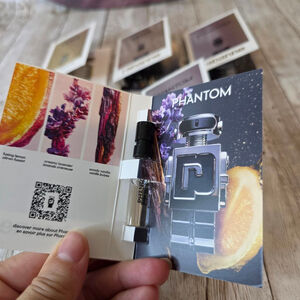 This lot includes five Paco Rabanne fragrance samples, each containing 1.5 ml (0.05 fl oz). Two samples are 'FAME' (one labeled 'paco rabanne', one 'rabanne'), and three are 'PHANTOM' (one 'ELIXIR', one 'EAU DE TOILETTE', one 'PARFUM'). Each clear glass vial with a black sprayer is housed within a white and gold/silver cardboard card featuring product branding and imagery. The items appear new and unused, with no visible imperfections.