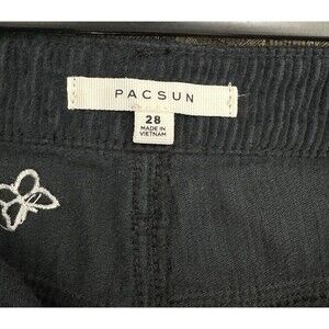 This PacSun mini skirt in size 28 features a unique butterfly pattern on dark corduroy fabric with a high-rise waist and zipper closure. The black skirt includes pockets and zipper accents, making it a stylish and functional piece for casual occasions during the summer, fall, or spring seasons. Made of 100% cotton, this skirt from Vietnam is a trendy addition to any woman's wardrobe.