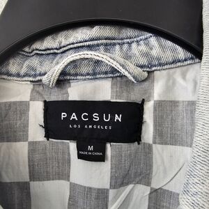 This PacSun denim jean jacket is a trendy addition to your wardrobe. The mid-length jacket has long sleeves with button closure and is made of 100% cotton denim material. It comes in a solid blue color with embroidered accents that add a touch of bohemian and festive vibe to your outfit.