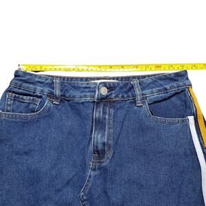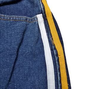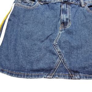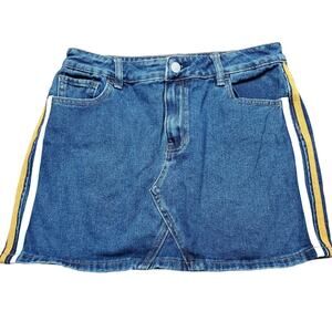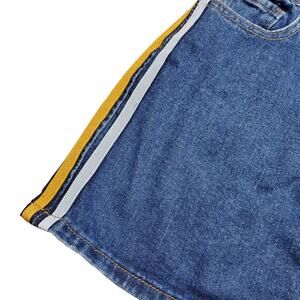 Medium to dark wash jean micromini with yellow and white varsity style stripes down side