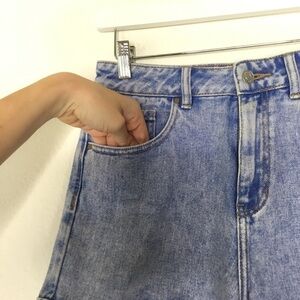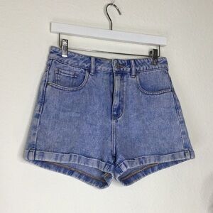 A pair of high waisted mom jean shorts. All real pockets and belt loops. A cuffed bottom and loose fit.