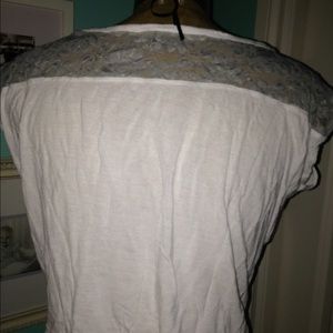 This shirt has so many cool and unique designs to it! It's got grey lace on the shoulders and back, it's has pretty green and yellow diamond shapes on the front and it has a front tie at the bottom! It has summer written all over it! No problems, great condition.