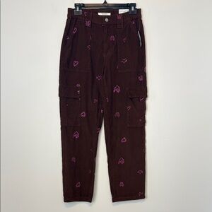 Pacun Heartbreaker Corduroy Cargo Elastic Waist Pants. Size small. New with tags. In excellent condition. Brown corduroy with pink hearts. Perfect for Valentine’s Day. Get ready to look good and break hearts when you rock the new Pacsun Heartbreaker Corduroy Cargo Elastic Waist Pants. These high-waisted skate pants feature a corduroy fabrication with heartbreak embroidery throughout, cargo side pockets, a stretchy elastic waistband for the perfect fit. Waist measures 26 inches. Rise 11 inches. Inseam 27 inches. Comes from a smoke free home.