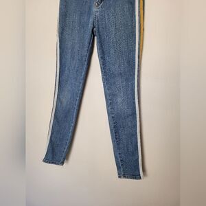 Super cute skinny jeans by Pacsun with a fun yellow and white Contracting racing stripes down the legs. Great condition. Tagged size 25 measures approximately 36 inches long 26 inseam (10 rise) 27 waist