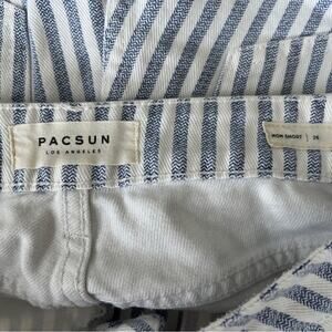 Pacsun Mom Shorts in a denim white and blue stripe. High waisted. Rolled hem. 100% cotton.