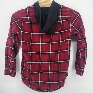 Stylish hooded flannel shirt by Pacsun, perfect for layering or wearing on its own. The shirt features a classic burgundy plaid pattern with white and black accents, offering a versatile and timeless look. It has a comfortable, relaxed fit with a button-up front, long sleeves with buttoned cuffs, and a curved hemline. The attached hood is made of a contrasting dark gray fabric with drawstrings, adding an extra layer of warmth and style. Whether you're heading to a casual weekend outing, a bonfire with friends, or just want a comfortable yet fashionable everyday option, this hooded flannel shirt is an excellent choice.