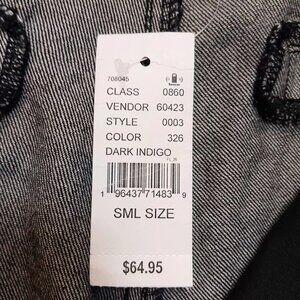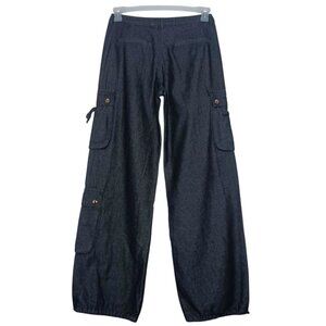 New with Tag. Women's Size SMALL. Please see photos for measurements. Dark Indigo with Silver Tone Snap Buttons. These classic dark indigo wash jeans sit low on the waist and feature cargo side pockets, adjustable drawcord ankle cuffs, and a loose baggy fit. Zip fly closure. Functional cargo and front slash pockets. Non-stretch denim fabric. Durable and holds it's shape. 100% Cotton. Lining 100% Polyester.
