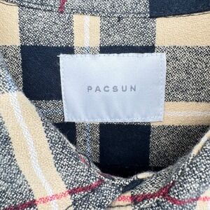 Command attention in this Pacsun flannel shirt, where classic style meets modern comfort. The earthy tan backdrop, overlaid with a bold black plaid and subtle red accents, speaks volumes about understated cool. A traditional button-down design is complemented by functional chest pockets, blending utility with timeless style. Imagine yourself wearing this versatile piece during a weekend hike, a casual coffee run, or a laid-back evening gathering with friends.