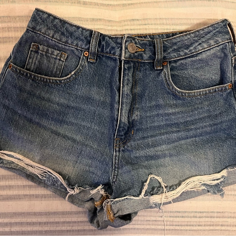 Stylish distressed denim shorts with frayed hems. Perfect for casual wear. Mom short. Size 27. Smoke free.