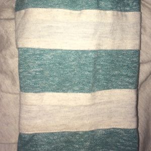 Teal and cream/white with arm stripes. Pacsun store brand. Long sleeve. Size fits between small and medium