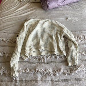 Chunky knit white sweater with black, yellow, and pink stripes.