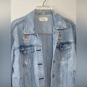The Pacsun Women's Distressed Blue denim jacket in size L features a mid-length design with long sleeves, making it perfect for the warmer seasons of summer, fall, and spring. The jacket showcases a regular fit with a classic blue color and denim lining, adding a touch of 90s style to any outfit. The distressed detailing gives it a trendy and unique look, ideal for casual everyday wear. Designed by PacSun and manufactured in China, this jacket is a versatile and fashionable addition to any woman's wardrobe.