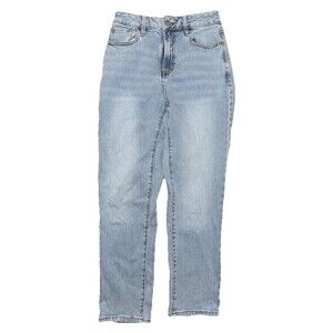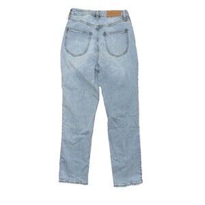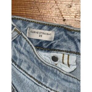 The product is a pair of Pacsun Women's Size 25 Curve Straight Blue Denim Jeans in a light wash. These jeans feature a solid pattern, regular fit, and straight style. They have a mid-rise waist with a 26-inch size, button and zipper accents, and pockets for added functionality. Made from denim fabric, these jeans are a stylish and versatile addition to any woman's wardrobe.