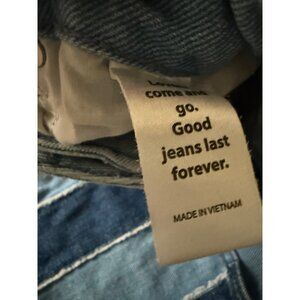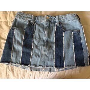 This Pacsun denim mini skirt combines light and dark blue panels with a trendy fringe hem for a stylish, casual look. Durable cotton material ensures comfort and longevity.