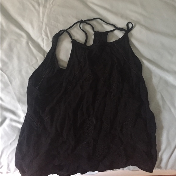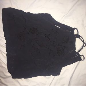 Black halter spaghetti strap top, with subtle flower pattern in front