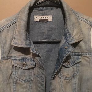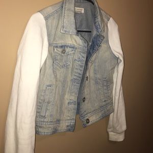 It's a jean jacket no stains on the white sleeves. The material and feel of the jacket is great doesn't quite fit me how I want, just want to get rid of it.