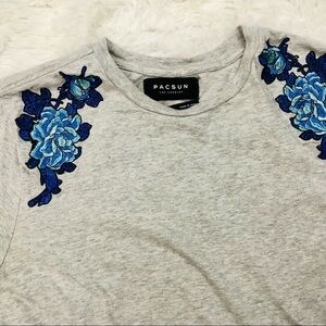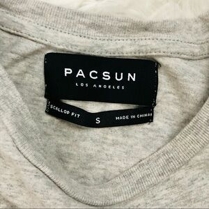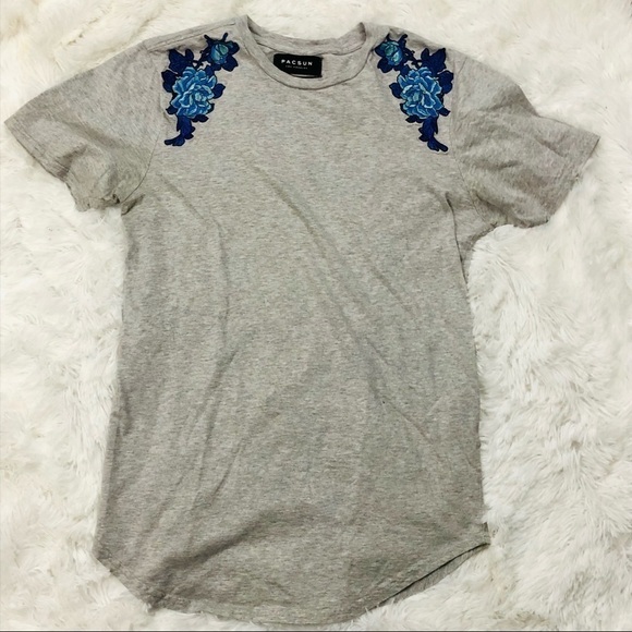 Pacsun gray short sleeve shirt with blue patchwork on the shoulders men’s size Small. Scalloped bottom. In great condition.