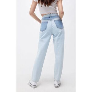 Pacsun Eco Hopper Patch Mom Jeans. Color block high rise straight leg jeans in a paneled design and 5 pocket design. Relaxed fit with tapered design. Color is medium indigo.