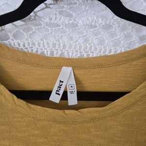 Pact 100% Organic Cotton Chai Luna Ruffle Sleeve Tee Mustard Yellow Boho in wonderful condition. Non-smoking, no pet home. Small pin hole at back ruffle from store tag. See last pic for details and ask any questions.