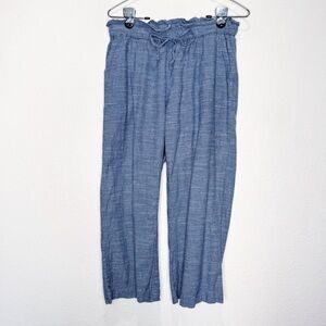 Featuring a pull on style with a drawstring waistband, high rise, cropped style, pockets, and wide leg in a lightweight chambray material.