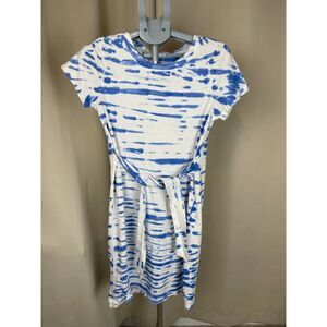 Pact women’s short sleeve T-shirt dress in blue and white tie-dye print. Made from organic cotton, features a belted waist for a flattering silhouette. Size Small.