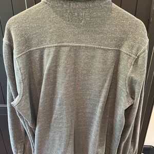Casual olive shirt jacket with button front. Features dual chest pockets. Ideal for layering.