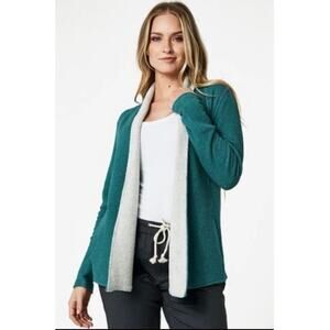 Pact Organic Cotton Open Cardigan Teal Green & Cream Medium Terry Pockets Drape