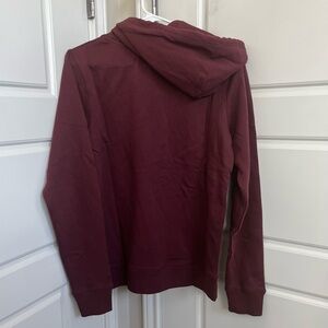 Pact raisin/ burgundy hoodie. Features a drawstring hood and front pocket.