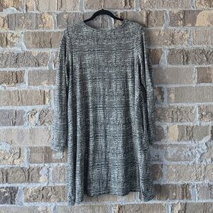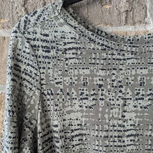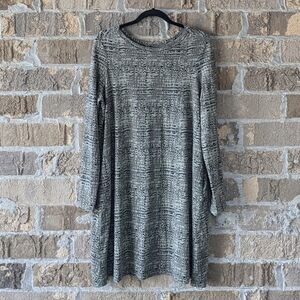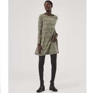 Excellent preowned condition Organic Cotton Shift Dress in Camo Tortoise from PACT. Scoop neck, long sleeved casual dress. Shift style dress that has a fitted top, then flares out from bust to hem. Taupe, sage, tan and black desert camo/tortoise all over print. Two side pockets hidden in seams at hip height. Sustainably and produced, made with premium certified organic material. No toxic chemicals and 81% less water used than conventional cotton. Get back into the swing of things with this swing dress!