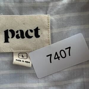 The product is a men's size large light blue striped button-up shirt made of cotton. It features a collared neckline, short sleeves, and a spread collar style. The shirt is suitable for various occasions including travel, parties, casual wear, work, and business meetings. It has a regular fit and comes with a pocket accent. The shirt is machine washable and made by the brand Pact in India. Perfect for all seasons, this classic and preppy shirt offers a timeless and versatile style for everyday wear.