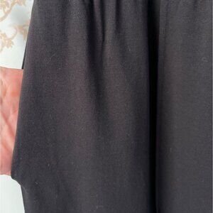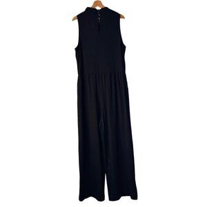 Soft and comfortable sleeveless black jumpsuit by Pact made from 95% organic cotton with a touch of elastane for stretch. Features a relaxed fit with a subtle cowl-style neckline, gathered seam waist, wide-leg silhouette, and keyhole back button closure. Small seam split near the closure (see photo), otherwise clean and in great condition. Perfect for travel, lounging, or casual everyday wear in sustainable comfort.