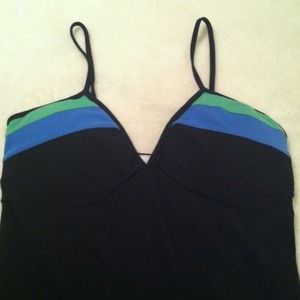 Plunging neckline, padded bust, spaghetti straps, green and blue accents on top.