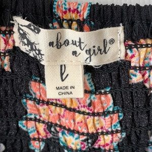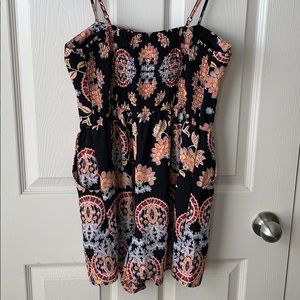 Black with multi colored print, key hole and tie in center, elastic on upper back, pockets, adjustable straps, and built in cups.