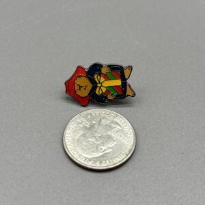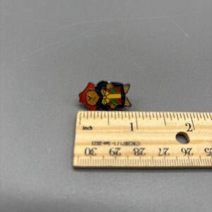 Vintage enamel lapel pin featuring Paddington Bear in his classic red hat and blue coat, holding a green and red striped Christmas present with yellow bow. Silvertone metal with butterfly clutch back. Pin measures just over 1 inch tall. New without tags/packaging. Unworn and in excellent condition. See photos for measurements and condition details.