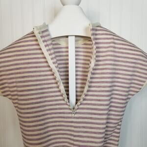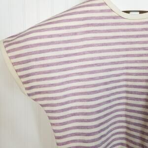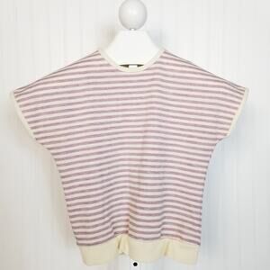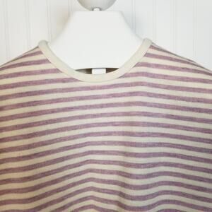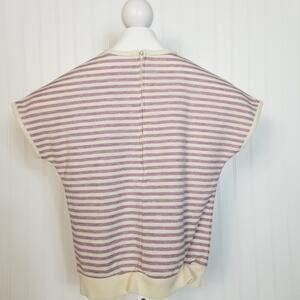 Gently used, no holes tears stains or snags. Bottom hem is a little puckered. Vintage brand Paddle and Saddle, cream and purple striped short sleeve shirt, crew neck, back 1/2 zip. No fabric tag, feels like a poly blend. No size tag, please look at measurements.
