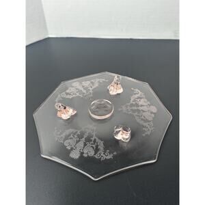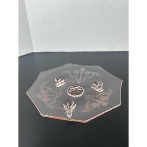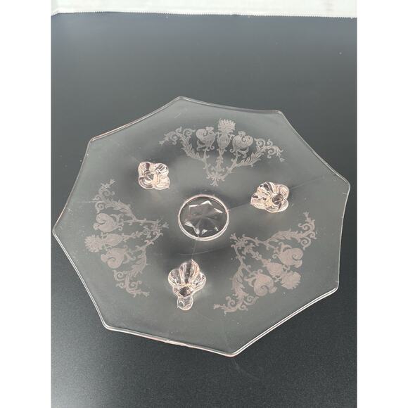 The Paden City Amber 3 Footed Plate with a Floral Design is a vintage, octagon-shaped piece of glassware made in America in 1939. This limited edition plate features a glossy finish and is etched with a pineapple pattern, making it a decorative and elegant addition to any occasion. Measuring 8.5 inches in diameter and 1.25 inches in height, this plate is a unique and collectible item for adult use, perfect for those who appreciate mid-century modern style and craftsmanship.