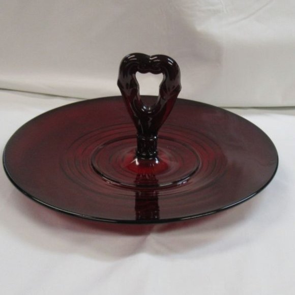 This is a really pretty elegant glass royal ruby red Penny Line center handled server or cookie tray made by Paden City Glass in the 1930s. This Penny Line server is in very good condition with no chips or cracks. There are three very small scratches (less than 3/4 inch long) on the edge of the surface of the tray. These small scratches would not show up in a picture. They are small but there. This is a hard handled server to find. It would make a great addition to any holiday table for Thanksgiving, Christmas, Valentine's Day, Easter, July 4th, etc. Be sure to search our other vintage glass trays and serving items available.
