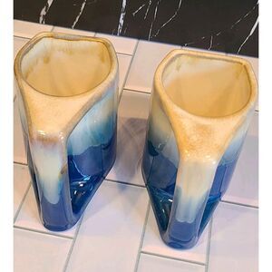 Padilla Set of (2) 4¼" Drip Glazed Blue/Beige Stoneware Mugs Unique Signed EUC