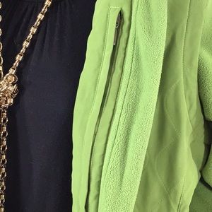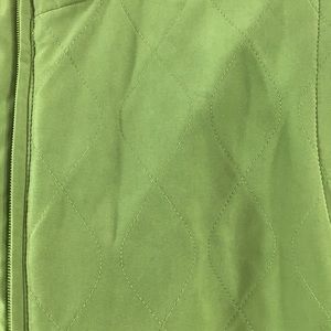 Poly/nylon fabric, body is quilted, arms are fleece, medium green color, zip front, arms zip off for use as vest, pockets, inside breast zip pocket for wallet/sunglasses, nylon lining, Page & Tuttle, size M, measured flat app: pits 19”, shoulder to hem 23”, good condition (T-58)