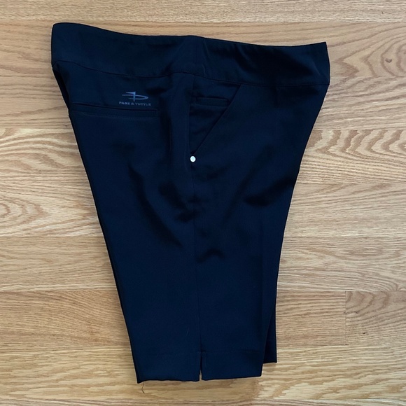 Page and Tuttle Women's Pull On Shorts in Black. Performance Tech material. Cool & sweat-wicking. Notches on either side of the hem. Inseam is about 10." Comfortable thick waist. Size Medium.
