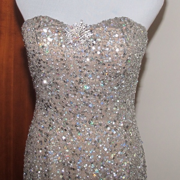 Beautifully beaded all over. Silver beads over caramel shell gives a pewter finish. This dress is stunning in and out of the spotlight.
