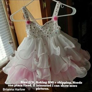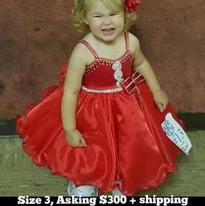 All pageant Dresses are size 18m to 4t, all are different prices, so message me which one you have question on with a picture. Prices i give you will have extra shipping price in with it, because $7.45 will not ship these dresses. Any questions ask please. Thank you
