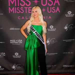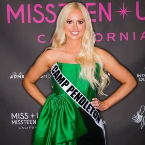 Beautiful Green corset top. Worn once for interview. May need to be dry cleaned but nothing visible. Large bow on the hip. It’s is very thick and structured material, extremely high quality, zips up the back. I’m 5’4 and wore 6in heels for height reference. One of a kind. Perfect pageant interview outfit (Top only!)